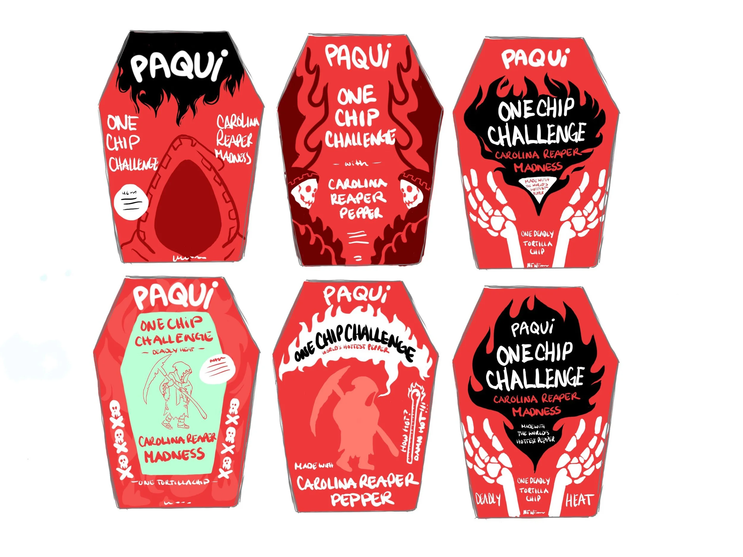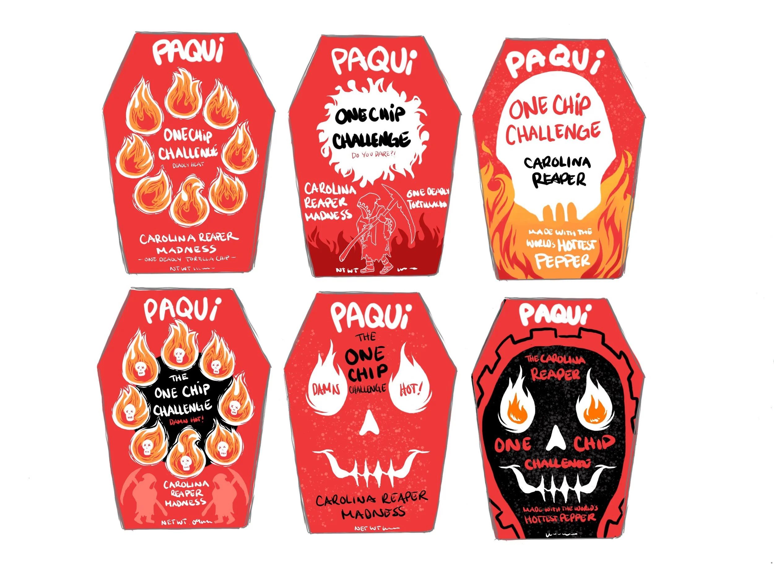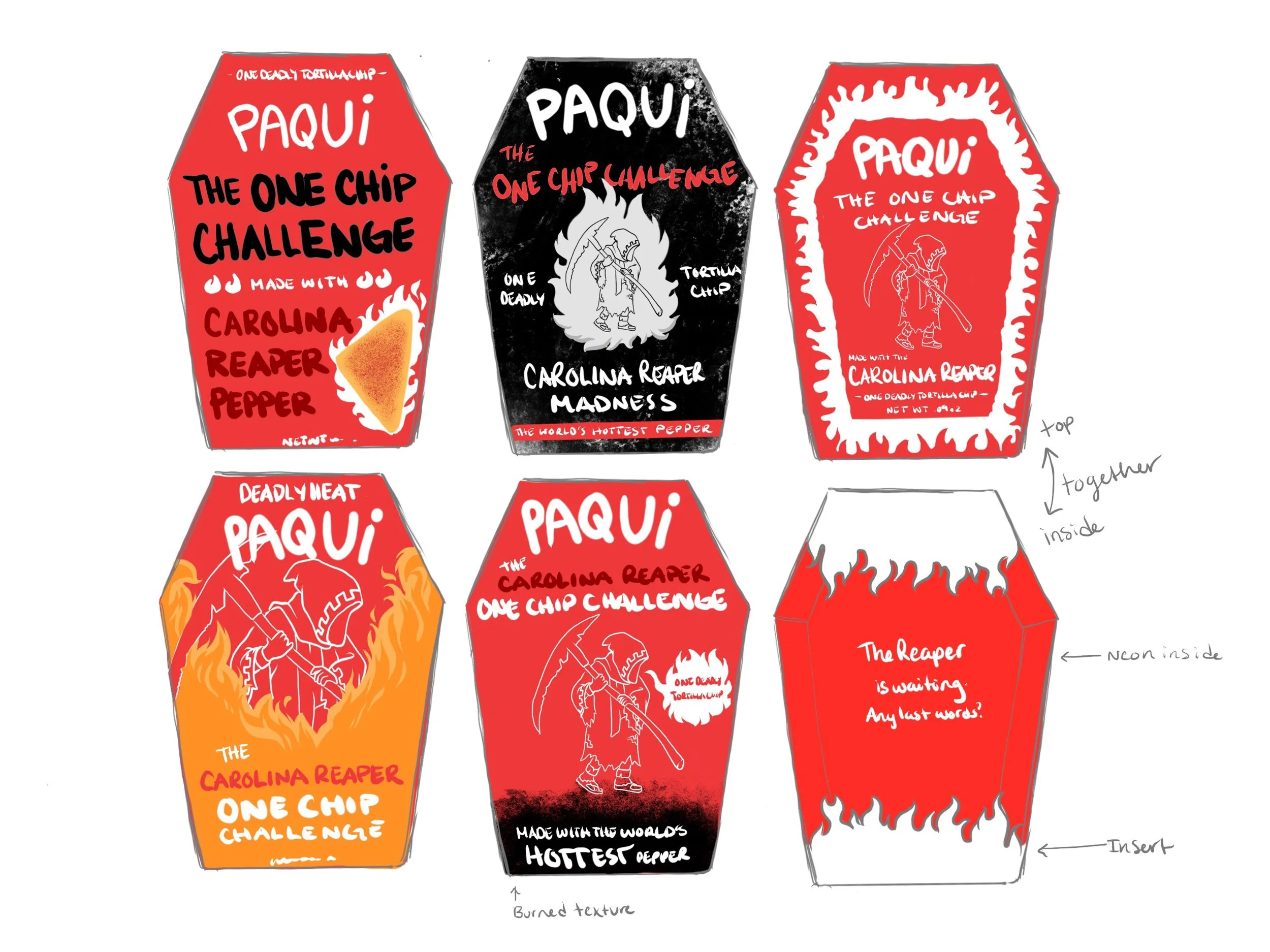 This design was a refresh of the Paqui One Chip Challenge from the year previous. A UV spot was added to the logo and the name, giving the box a shine and texture when holding it. The inside illustrations also emphasizes the hot nature of the challenge.